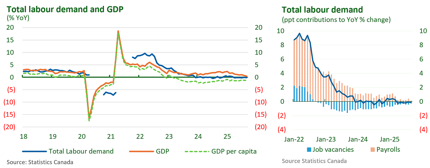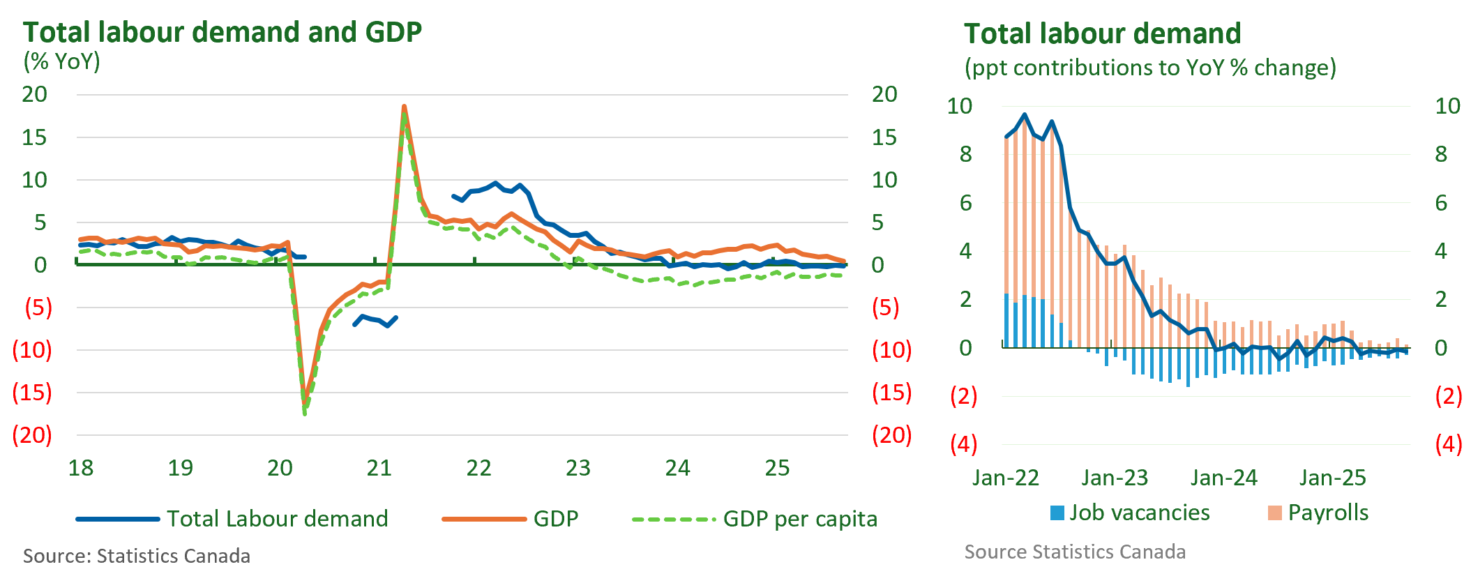 On that point, the chart on total labour demand shows something intriguing. First note that total labour demand growth has been essentially flat since early 2024. That is, the positive contribution from payroll employment growth was largely offset by the decline in job vacancies.